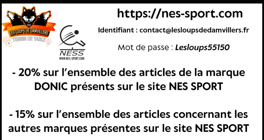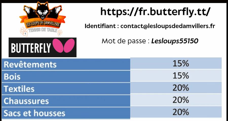 Bonjour les Loups, en utilisant l’identifiant : contact@lesloupsdedamvillers.fr et le mot de passe : Lesloups55150, vous bénéficierez de divers réductions chez Butterfly et Nes sport.